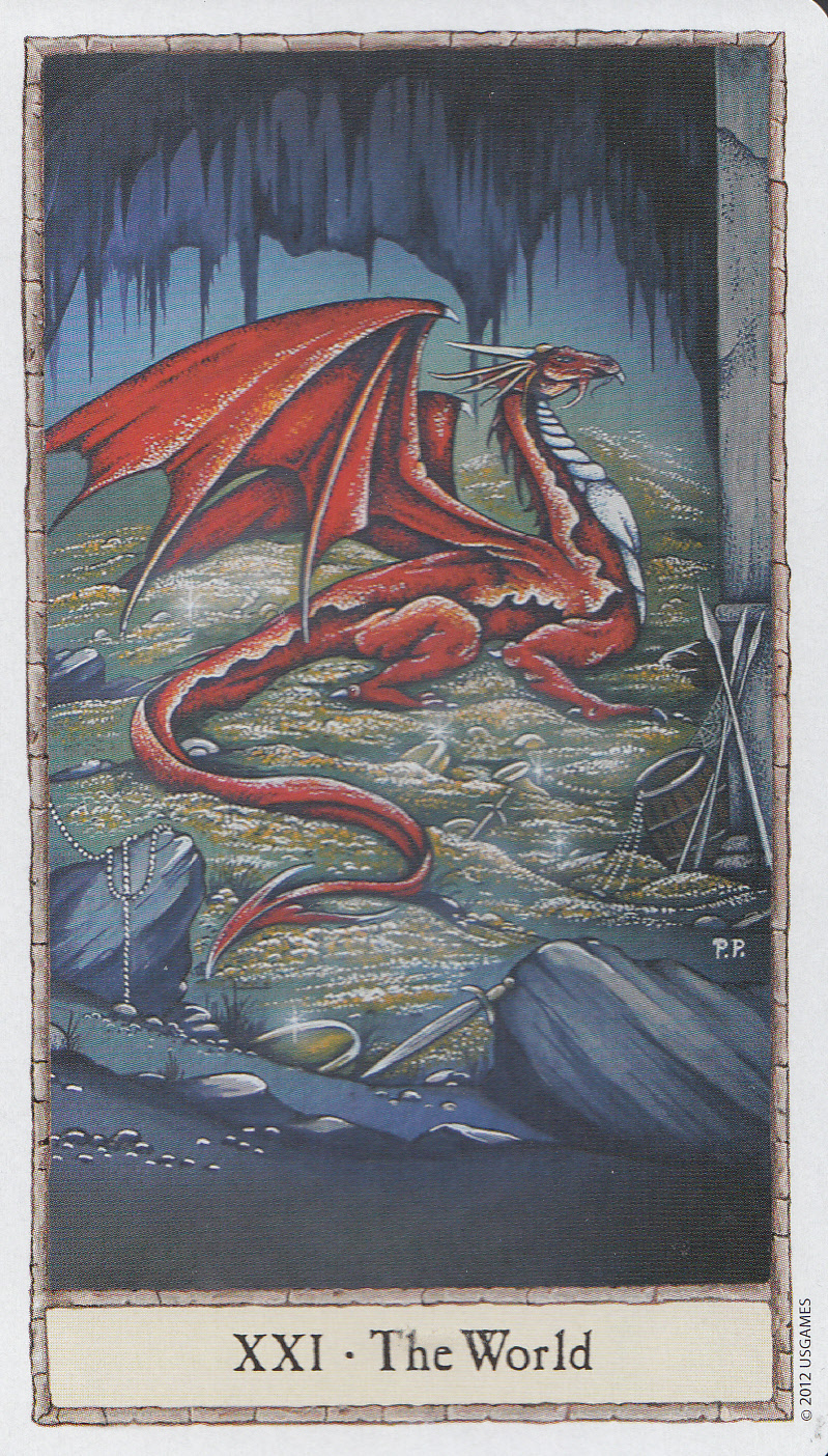 В Таро "Хоббита" (есть и такое) на аркане "Мир" изображен Смауг, возлежащий на груде сокровищ. Я не большой знаток Таро, но, насколько я понимаю, "Мир" символизирует то самое царствие Божие, что наступит после Страшного Суда. Где все завершено, цельно и правильно, где каждый на своем месте. Вспоминается, как в "Хоббите" (в книге, не в фильме) в самый трэшовый момент Битвы пяти воинств Бильбо вдруг просветлился и осознал, что лучше бы дракон и дальше лежал на золоте, чем вотэтовсе.