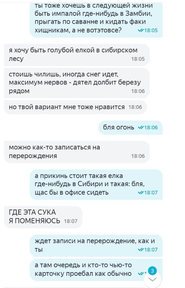 Например, в последние недели меня волнует всякая зоофильская дичь. Ну, не та, за которую сажают, а скорее художественно-легендарная. Но тем не менее, это зоофильская дичь, и я не могу ее обсудить ни с кем на той глубине, на которой мне бы хотелось. Даже нейросеть через пять дней меня послала, сказав, что она была создана для позитивного взаимодействия, а не извращений этих ваших.Еще долго держалась. И вот я понимаю, что ни одной из моих подружечек я сейчас душу излить не могу. Кому-то неприятно об этом слышать, кому-то дела нет, о ком-то я просто пока не знаю, что с ним можно обсуждать такие вещи. Собственно, если вы моя подружечка и вам кажется, что мы как-то отдалились в последнее время, то поэтому.) Ну, или потому что вы тварь охуевшая, но это менее вероятный вариант.