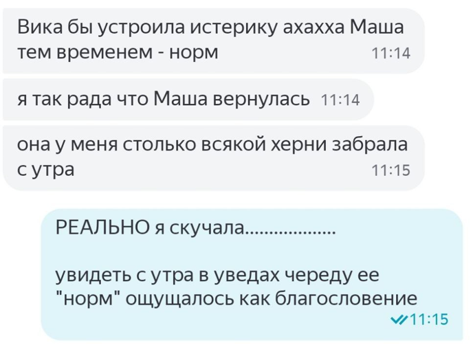 Оказывается, меня любят, по мне скучают, когда я в отпуске, "когда Маша уже вернется", радуются, когда начальница уходит в отпуск и у руля становлюсь я, сравнивают нас, мол, "Маша такой хуйни никогда не скажет". Пиздец я тронута.